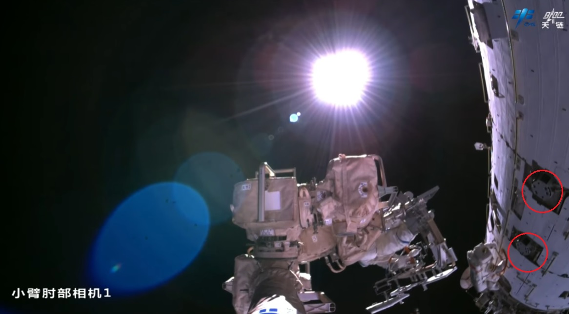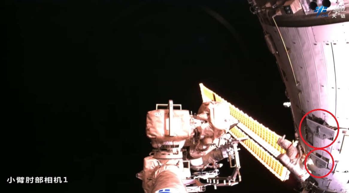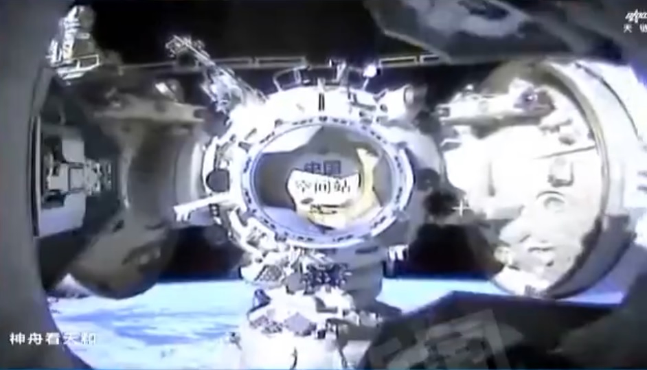 Trochu horší kvality, ale zato neobvyklý pohled na připojené kosmické lodě Shenzhou-20 [Šen-čou 20] (vlevo) a Shenzhou-22 [Šen-čou 22] (vpravo) při ručním přesunu Wu Feie [Wu Feje] po povrchu laboratorního modulu Wentian [Wen-tchien].