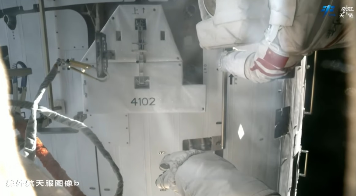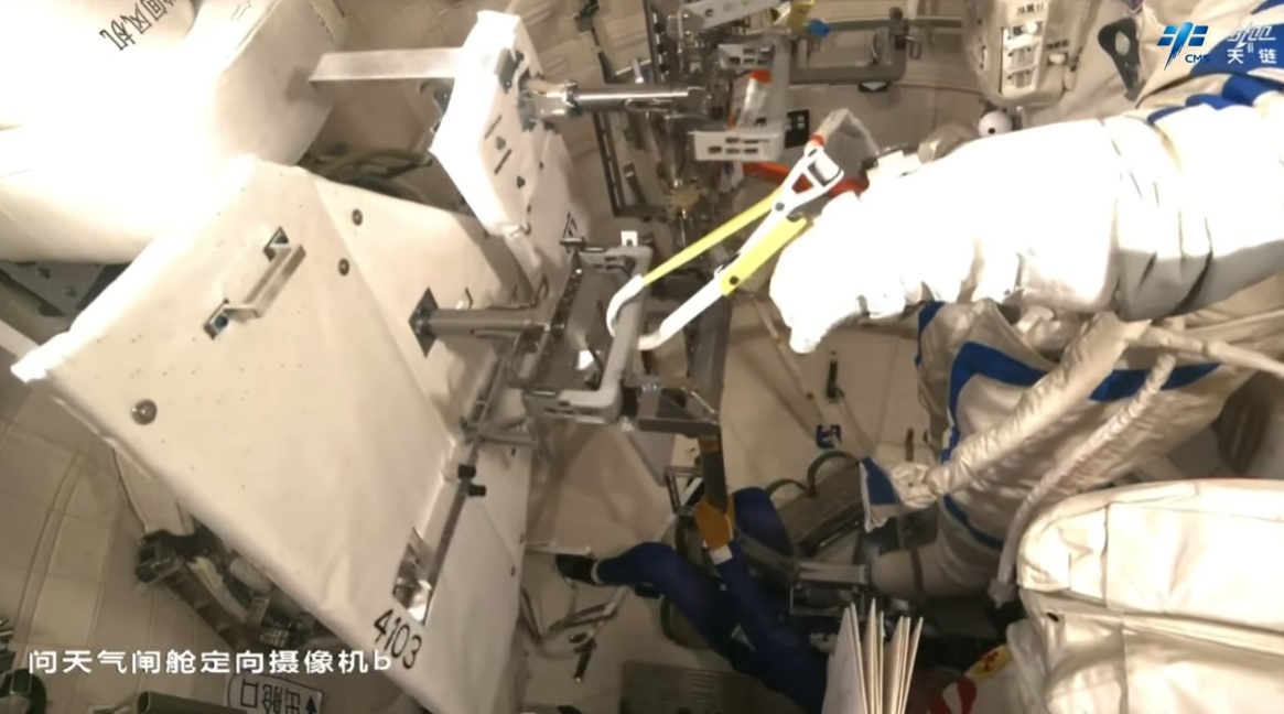 Wu Fei [Wu Fej] zatím zůstal uvnitř přechodové komory a podával Zhang Luovi [Čang Luovi] vybavení, což v tomto případě byla kamera s vysokým rozlišením a dva ochranné panely proti mikrometeoritům a kosmickému smetí.