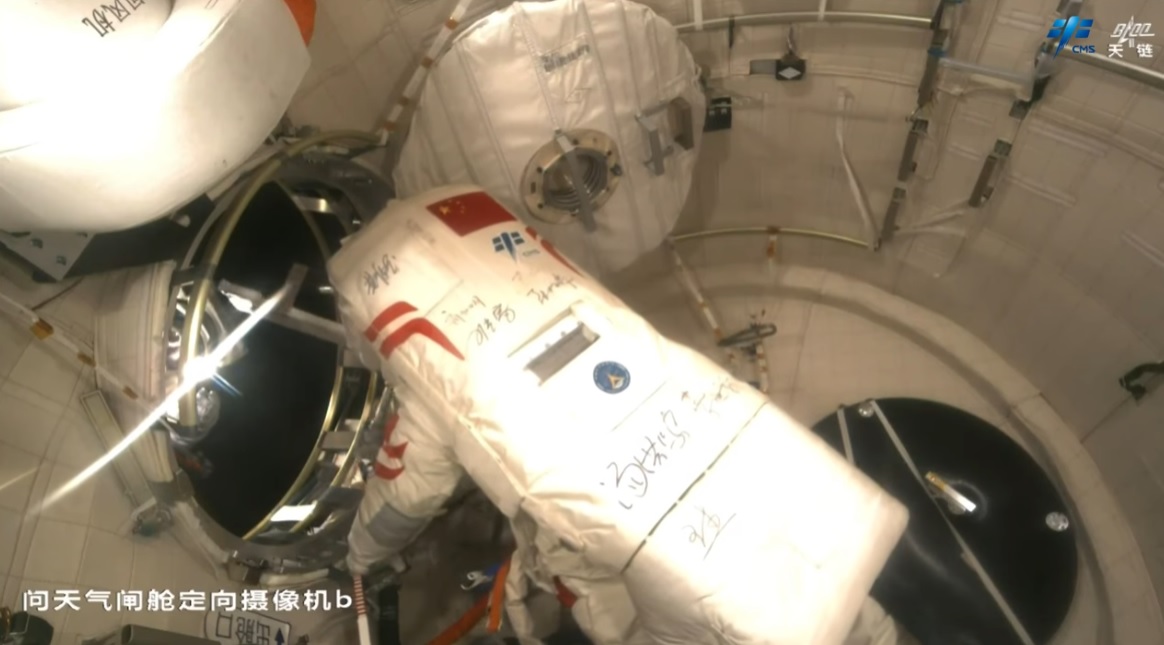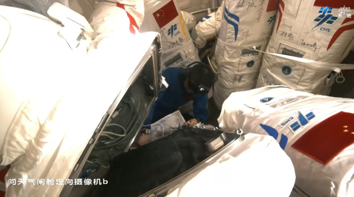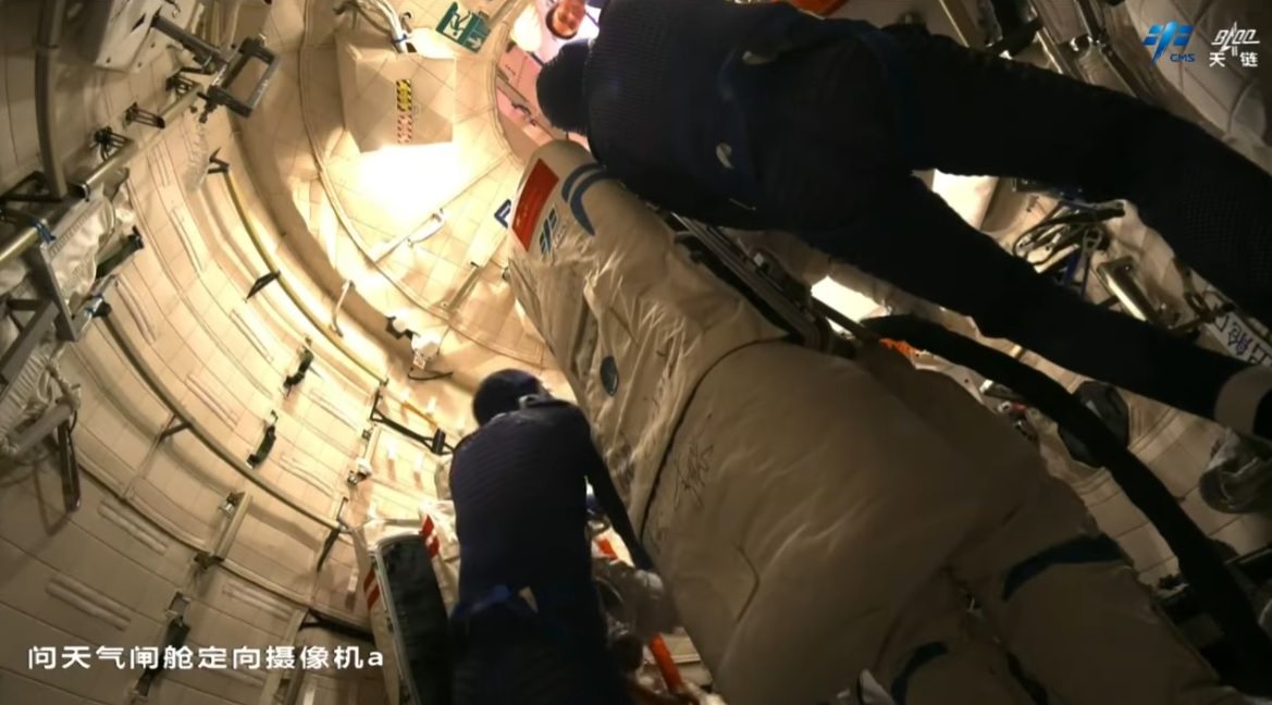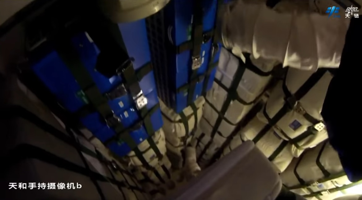 Čínská agentura pro pilotované lety (CMSA) využila toho, že byla kabina bez kosmonautů a poslala zpět na Zemi skafandr Feitian [Fej-tchien] s modrými rozlišovacími pruhy (B), který byl použitý při dvaceti kosmických vycházkách, čímž dosáhl maximálního povoleného počtu použití. V prostoru kabiny bylo ještě několik velkých předmětů. Sice je to velice špatně vidět, ale v pravém spodním rohu obrázku je ten poškozený průzor. Nicméně z tohoto snímku nelze nijak usuzovat o instalovaném ochranném prvku.