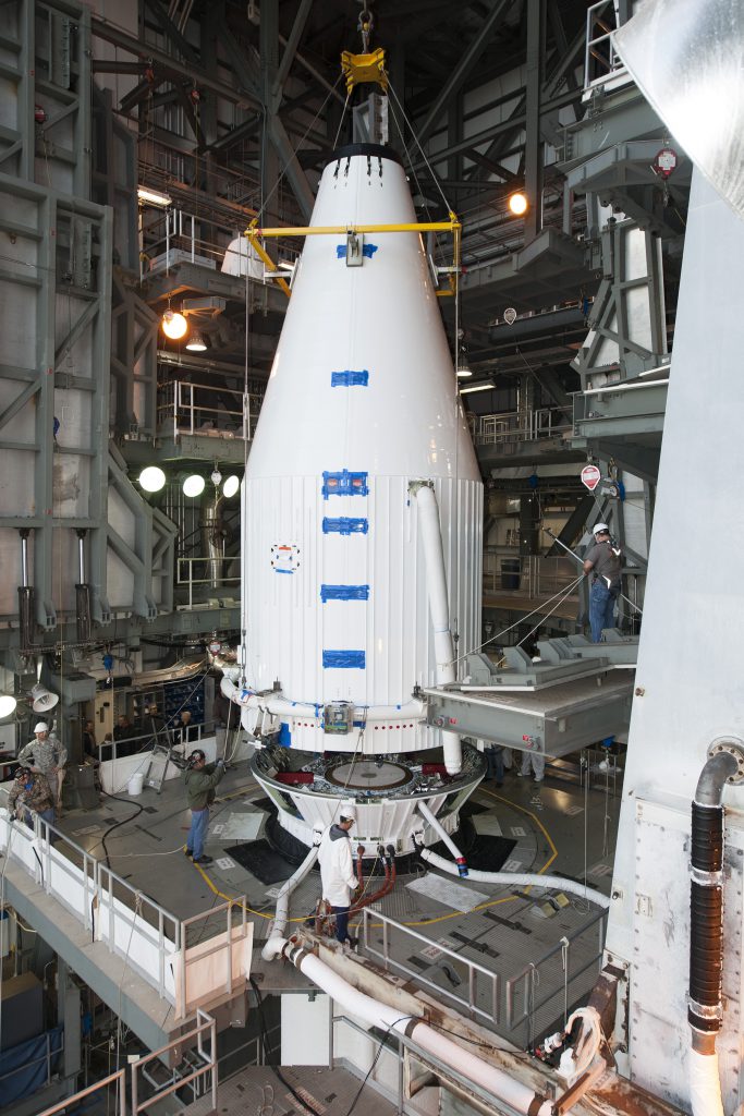 Fotografie z přípravy nosné rakety Atlas V 411, horního stupně Centaur a sondy OSIRIS-REx. Sondu o hmotnosti 2,11 tuny čeká sedmiletá cesta k asteroidu Bennu a zpět na Zemi.